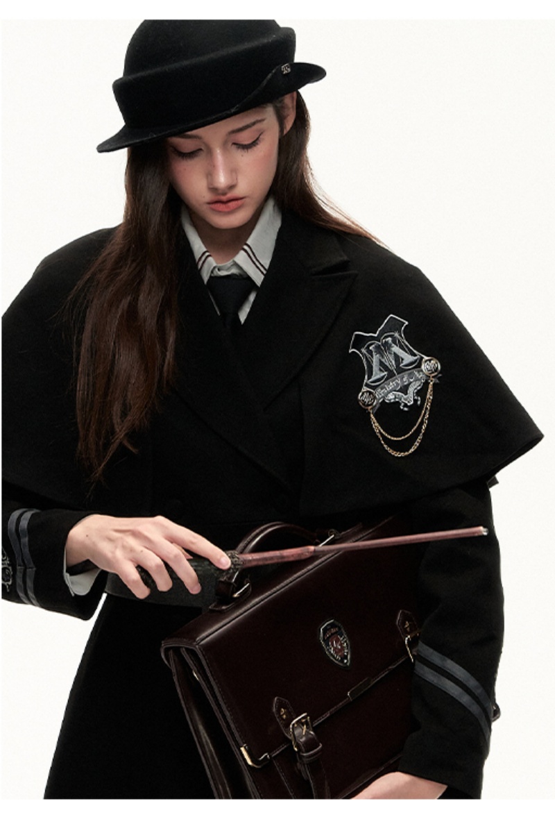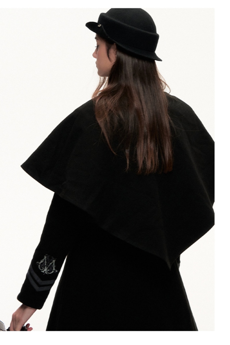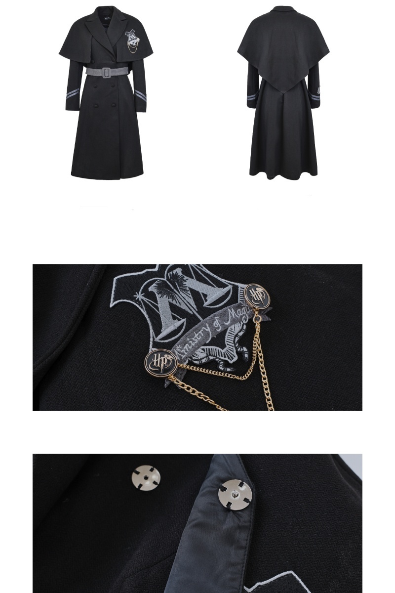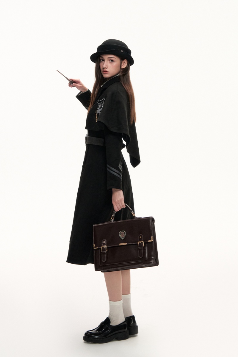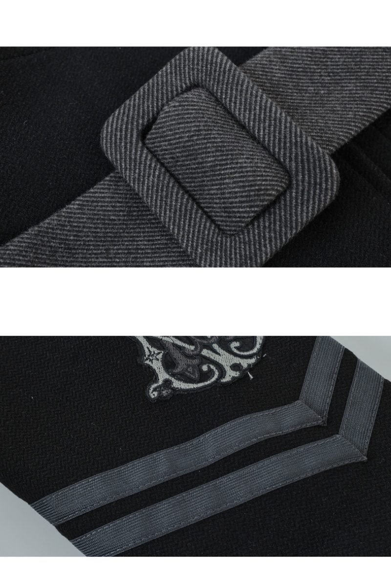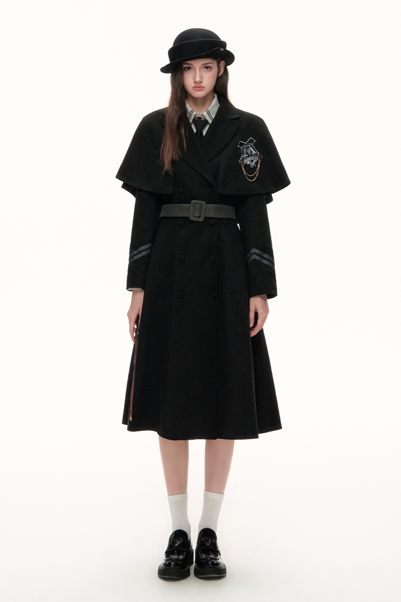 The dark overcoat paired with a contrasting-colored belt, and the chain decoration can be removed.