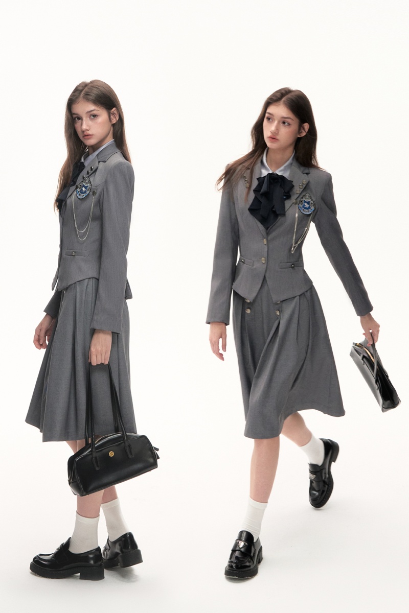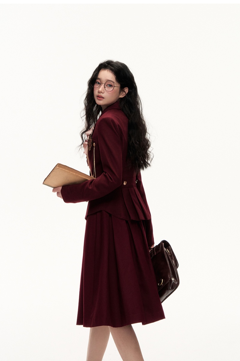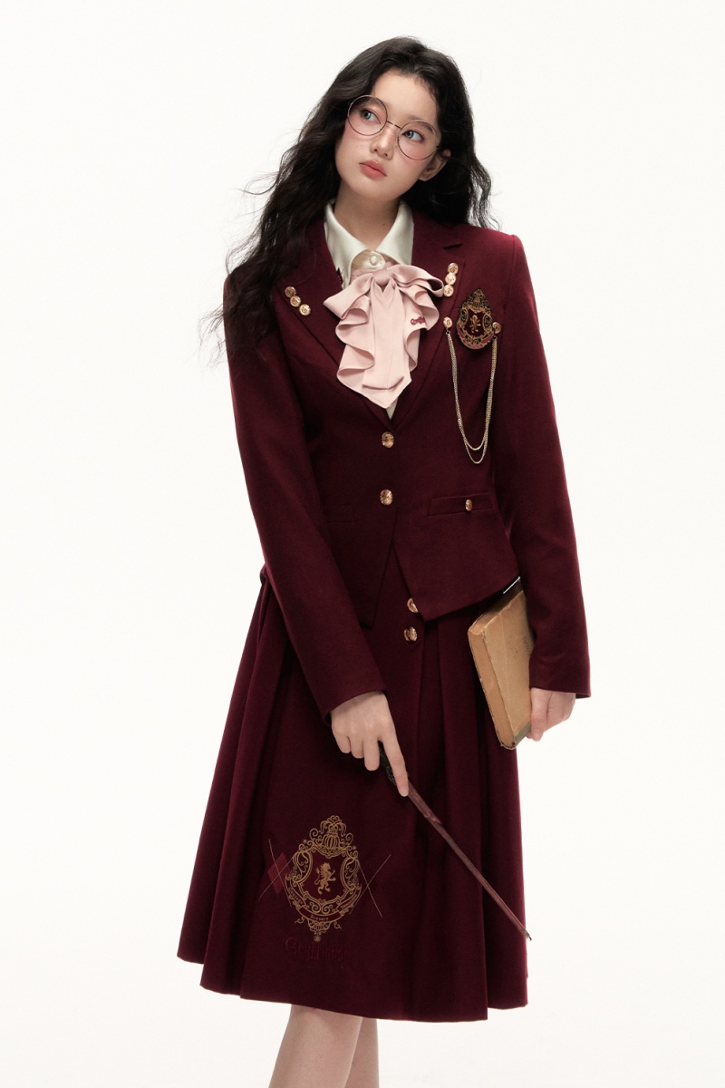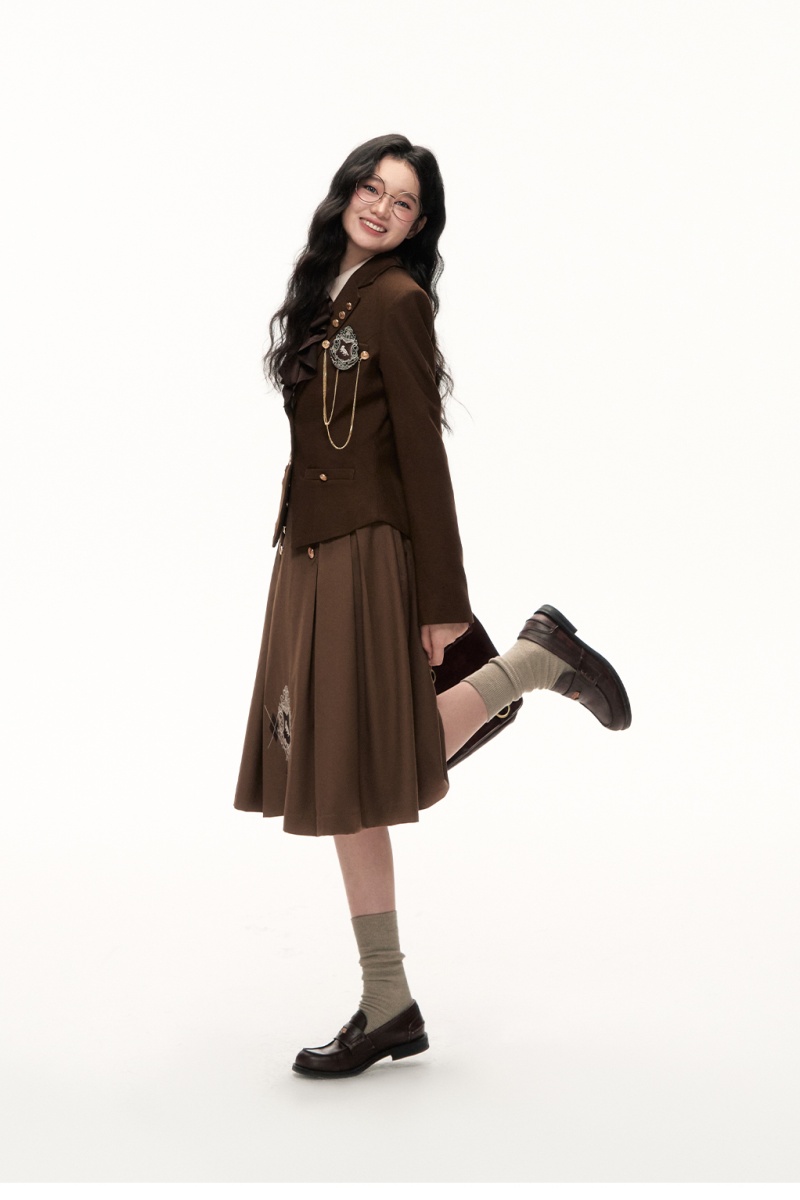 The coat is paired with a swallowtail design. The blouse adopts lacework and the hem is pleated. The skirt features an arched high waist and a double-breasted design, exuding a retro yet elegant charm.