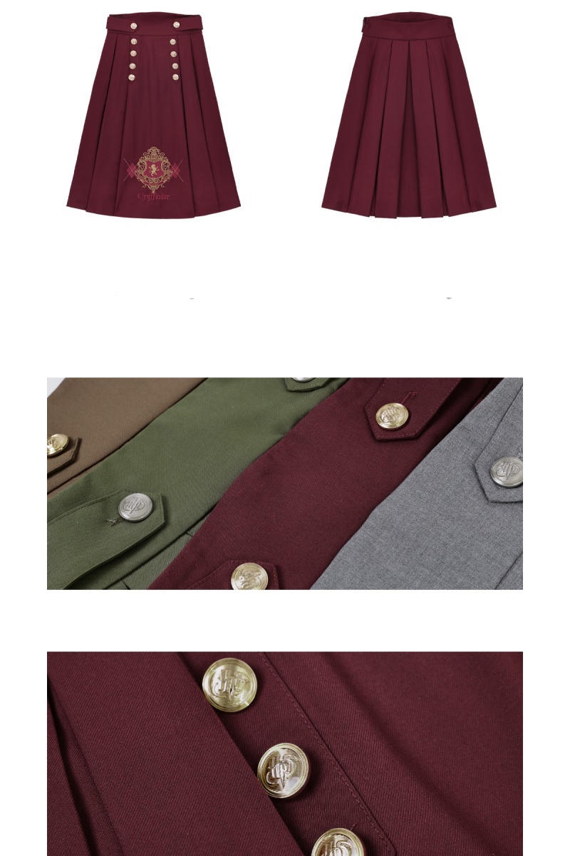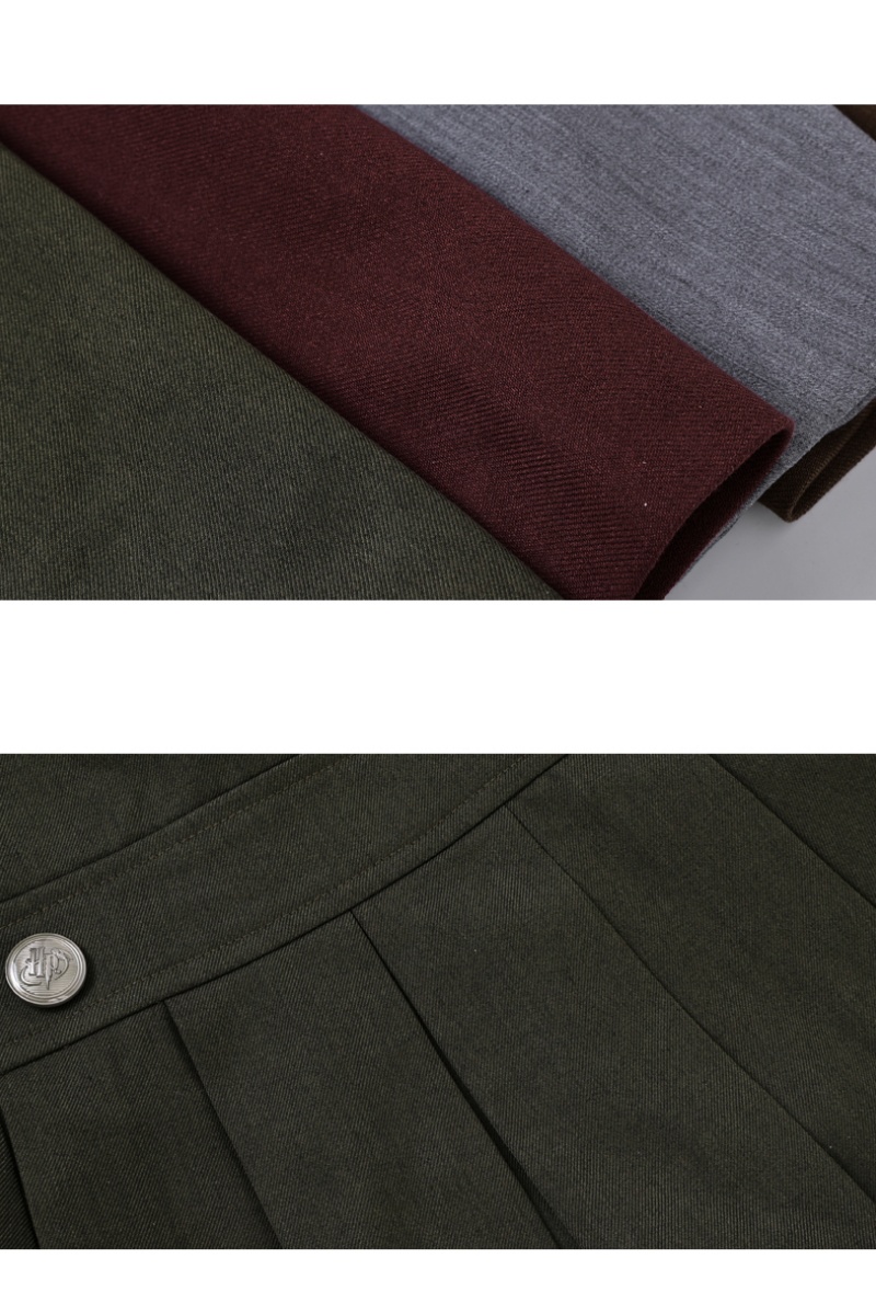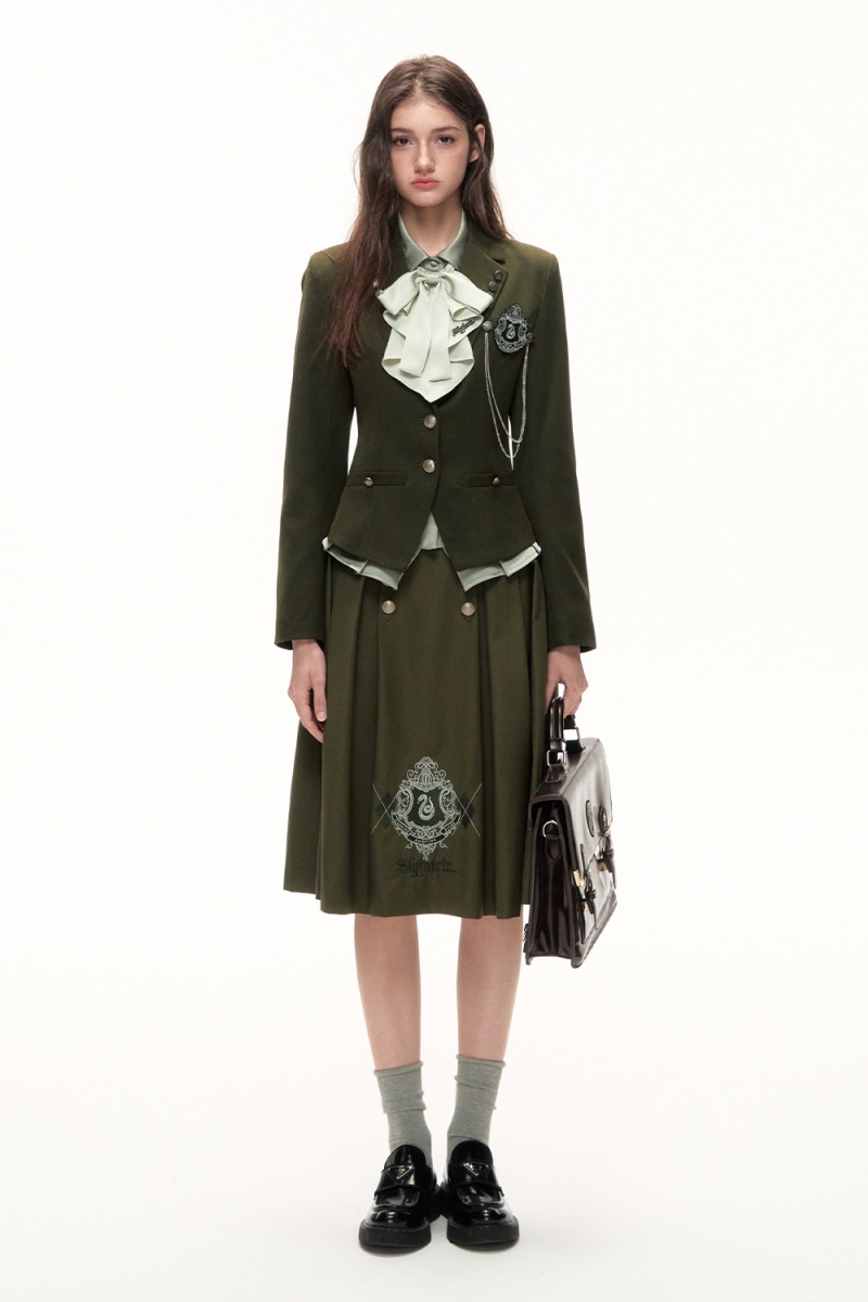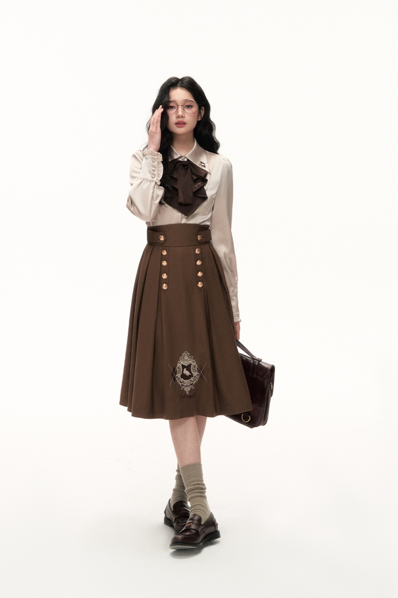The coat is paired with a swallowtail design. The blouse adopts lacework and the hem is pleated. The skirt features an arched high waist and a double-breasted design, exuding a retro yet elegant charm.