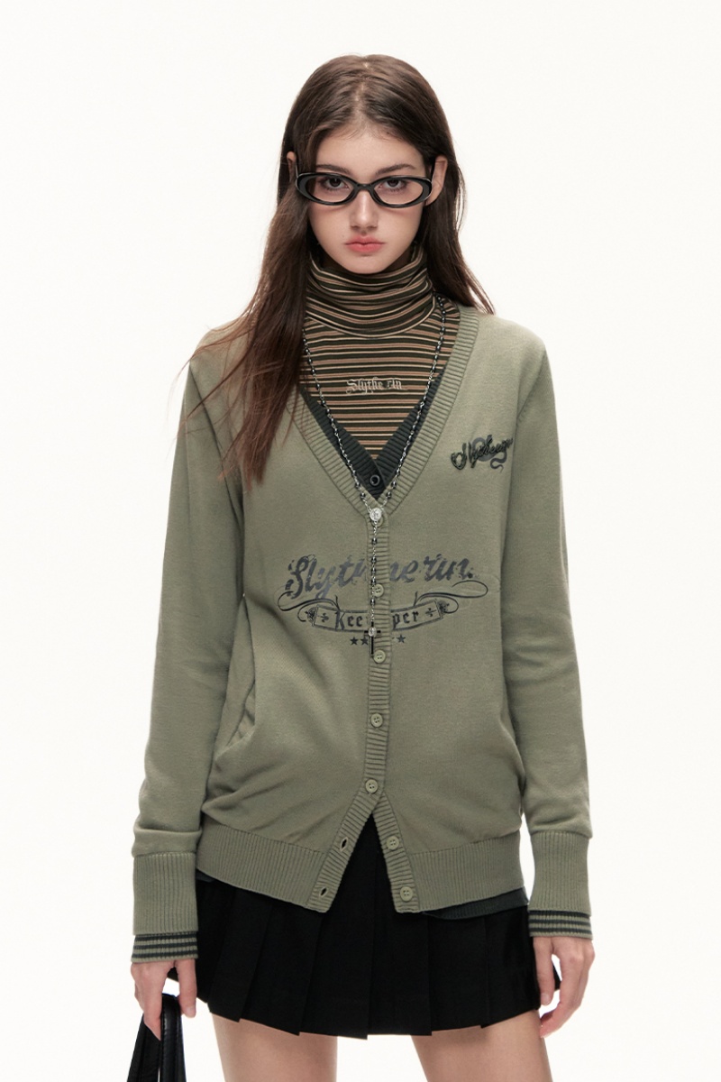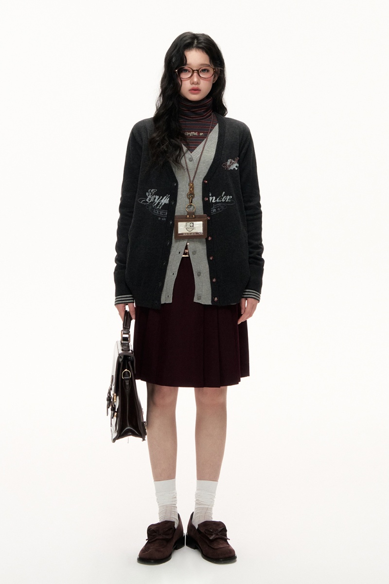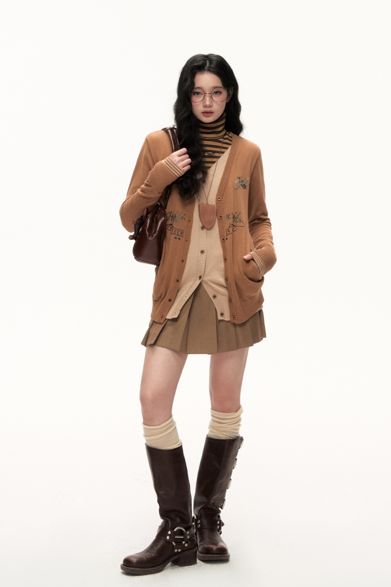 Two fake knitted cardigan, print and contrasting color embroidery, easily create a warm atmosphere.