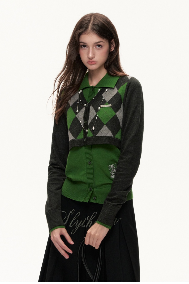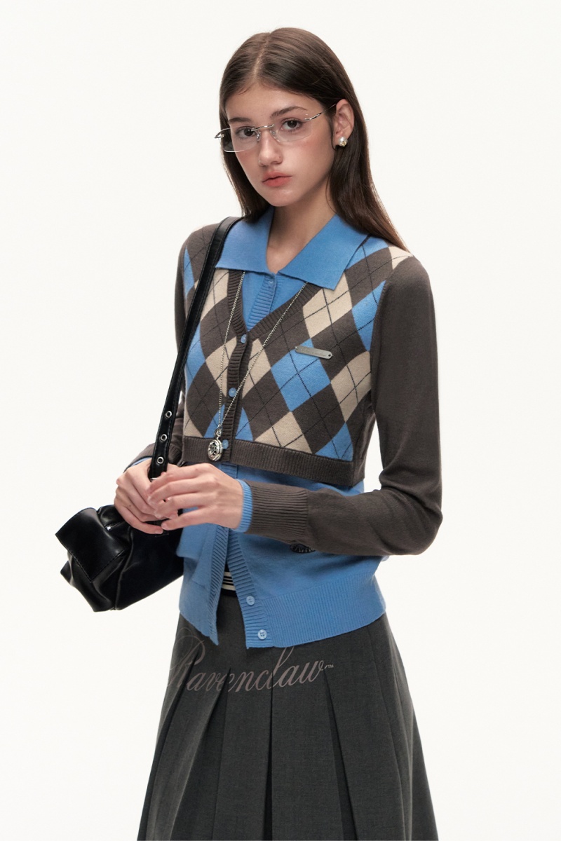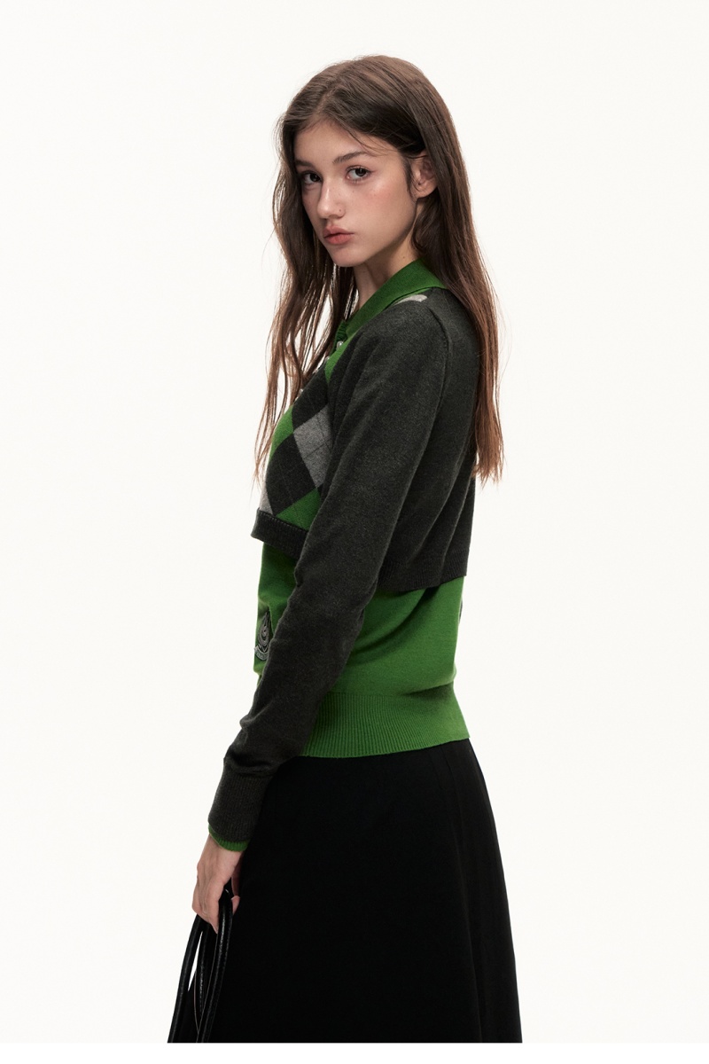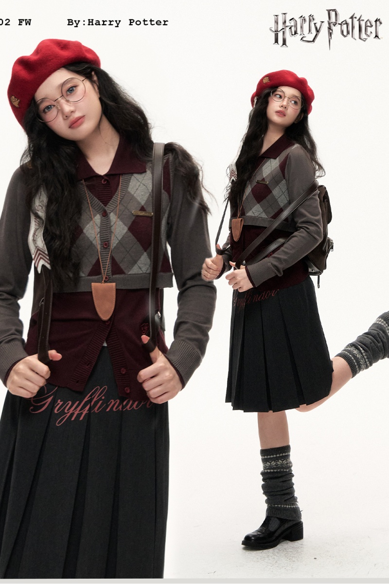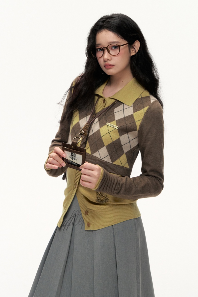 The fake two-piece cardigan with design layers, the diamond-shaped pattern adds a more school-like feel. The skirt is color-blocked and patchwork, with embroidery and prints from the school.