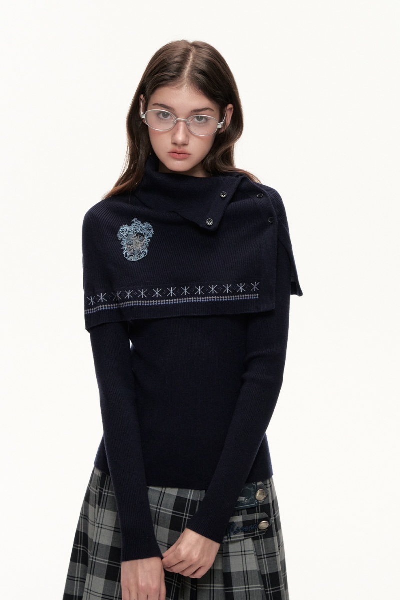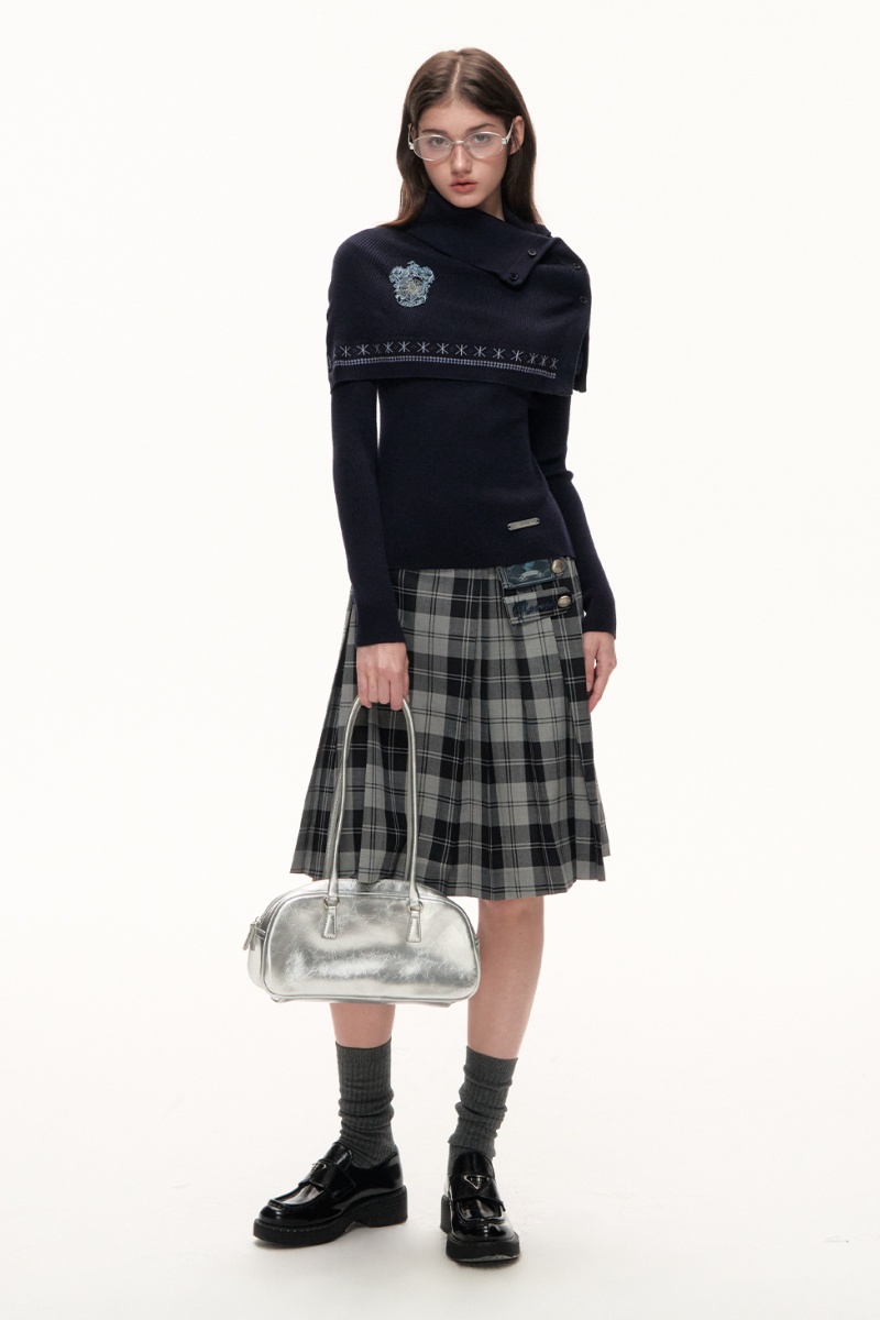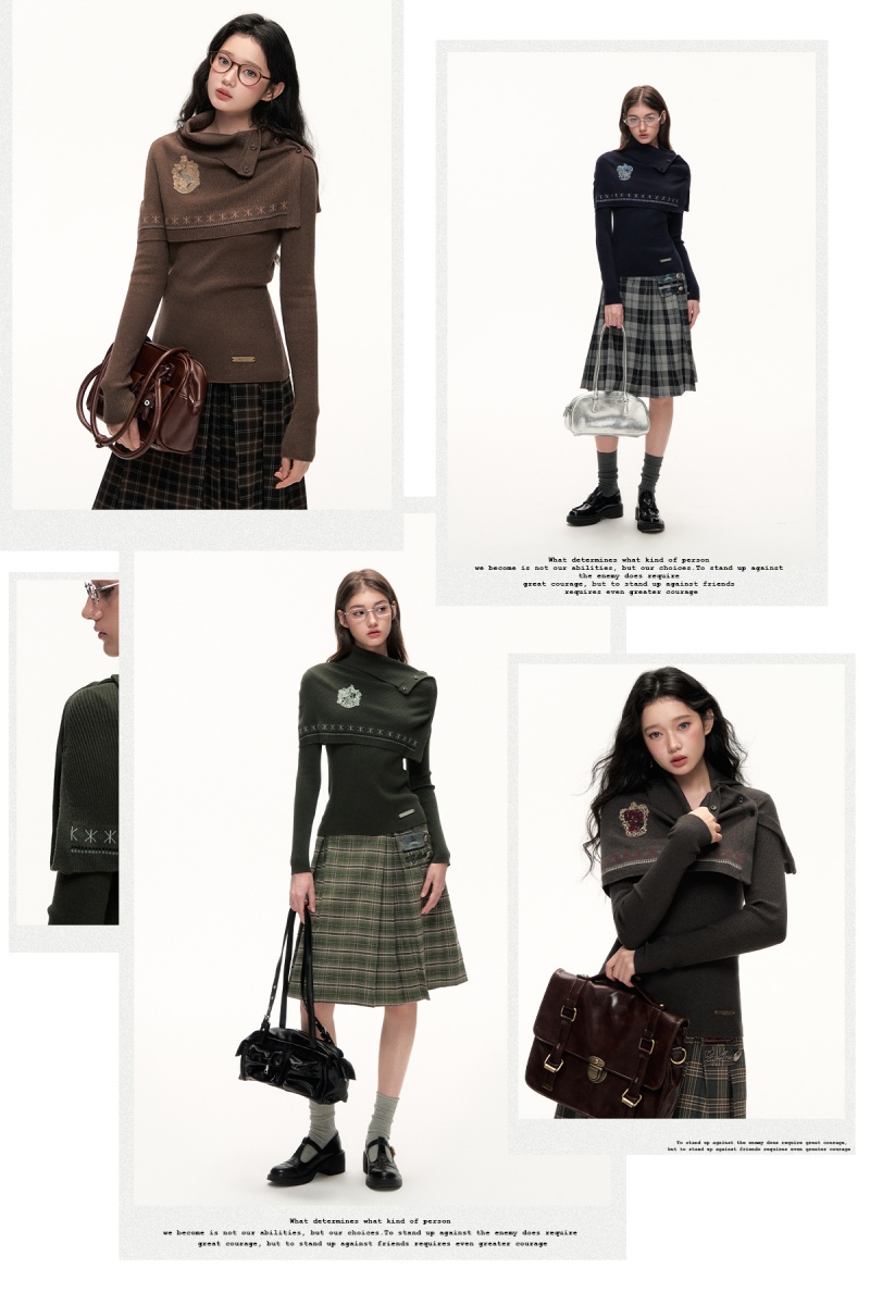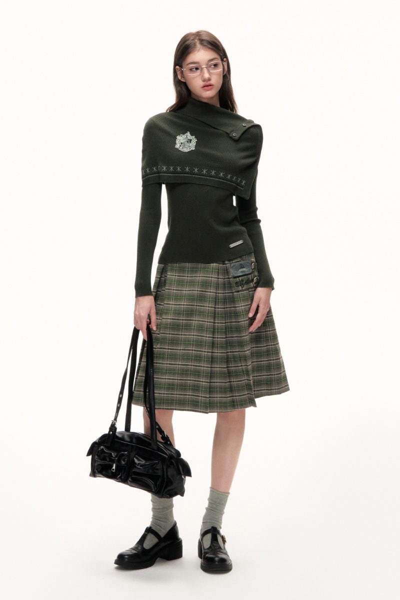 Inner is a slim knitted sweater inside, and outer is a short cape. The skirt is made of plaid fabric, looking lively and elegant.
