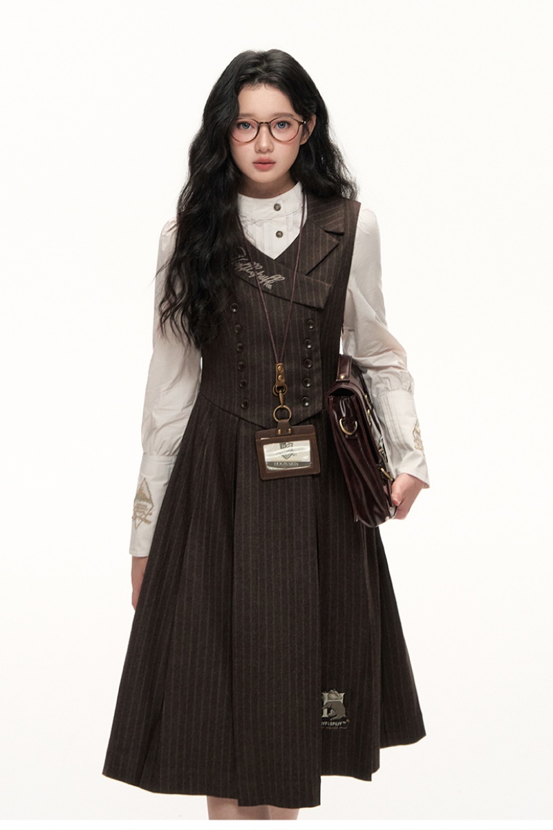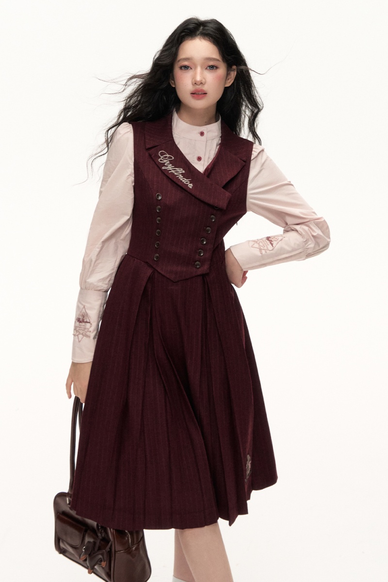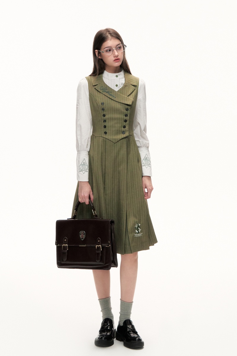 This stand-up collar shirt adopts retro sleeves and front opening buttons, and the waistline of the vest skirt is simple and slim.